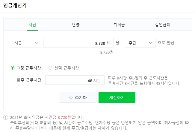 네이버에 최저시급을 검색하시면 책정된 최저시급에 따른 임금계산기로 계산이 가능한데요.