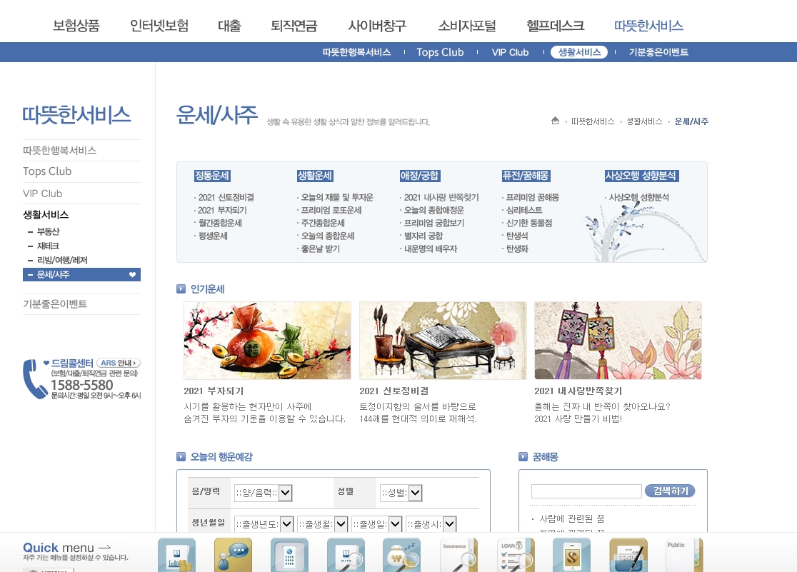 생활운세로는 오늘의 재물 및 투자운, 프리미엄 로또운세, 주간종합운세, 오늘의 종합운세, 좋은날 받기.
