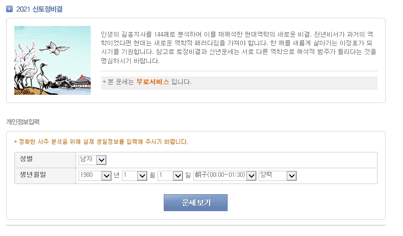 정통운세로는 2021 신토정비결, 2021 부자되기, 월간종합운세, 평생운세를 제공하고 있고요.
