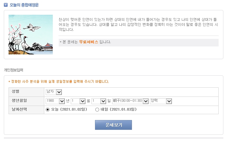 성별, 생년원일 그리고 태어난 시를 입력하시고 운세보기를 클릭하시면 끝!!!