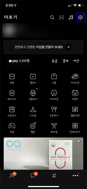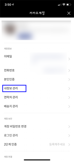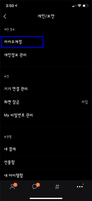 4. 맨 위에 '카카오계정' 터치해주세요.