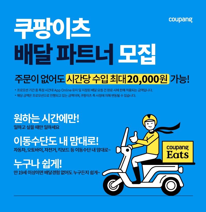 시간 제약없이 언제든지 편안하게 할 수 있는 꿀알바! 쿠팡이츠 배달파트너스를 추천해드립니다^^