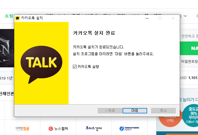 이어서 카카오톡 실행을 해주시면 됩니다. 체크박스를 유지하시고 '마침'을 클릭해주시면 바로 실행된답니다.