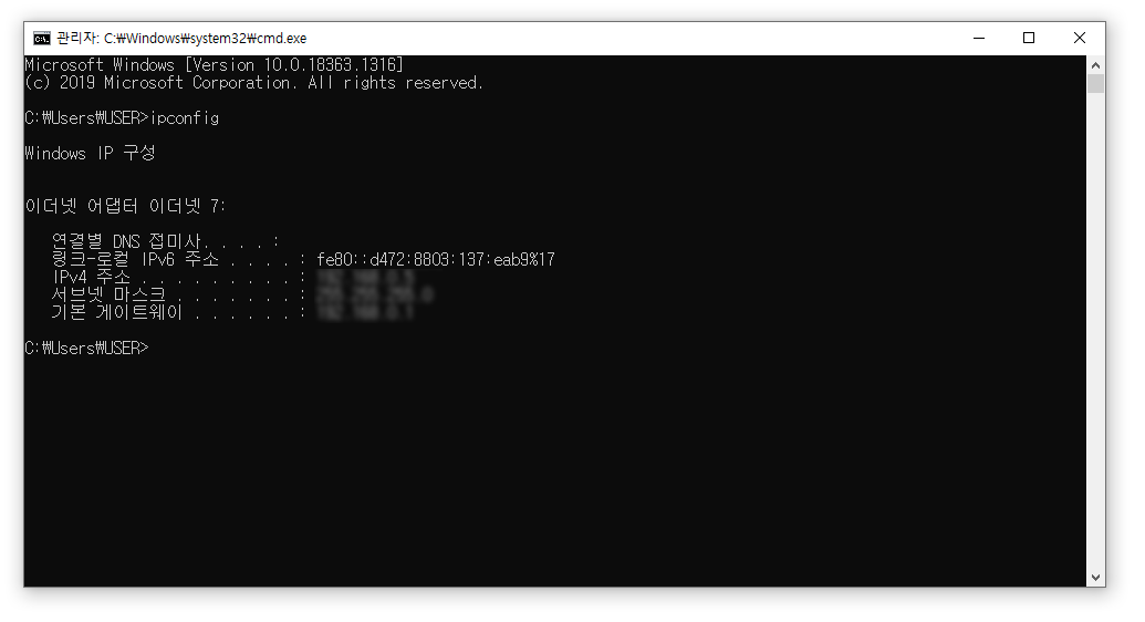 이때 ipconfig를 입력하고 엔터를 눌러주세요.