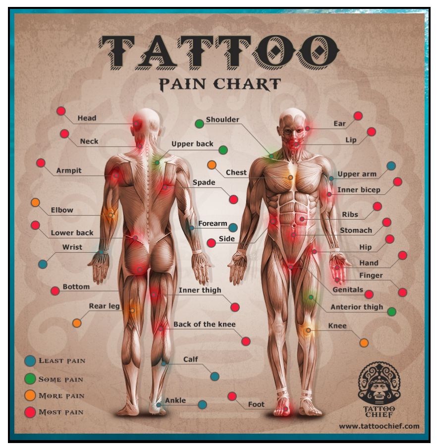 타투는 표피층에 바늘을 통해서 상처를 내고 진피층에 잉크를 주입해 세포를 염색 시키는 방식입니다, 신체부위에 그림이나 글씨를 새기게 되면서 '상처'가 생기므로 피부층이 얇은 부분이나 뼈가 있는 부분은 신경이 밀집되어있어 통증이 더욱 심하답니다. 하지만 사람마다 고통의 정도는 다를 수 있습니다.
