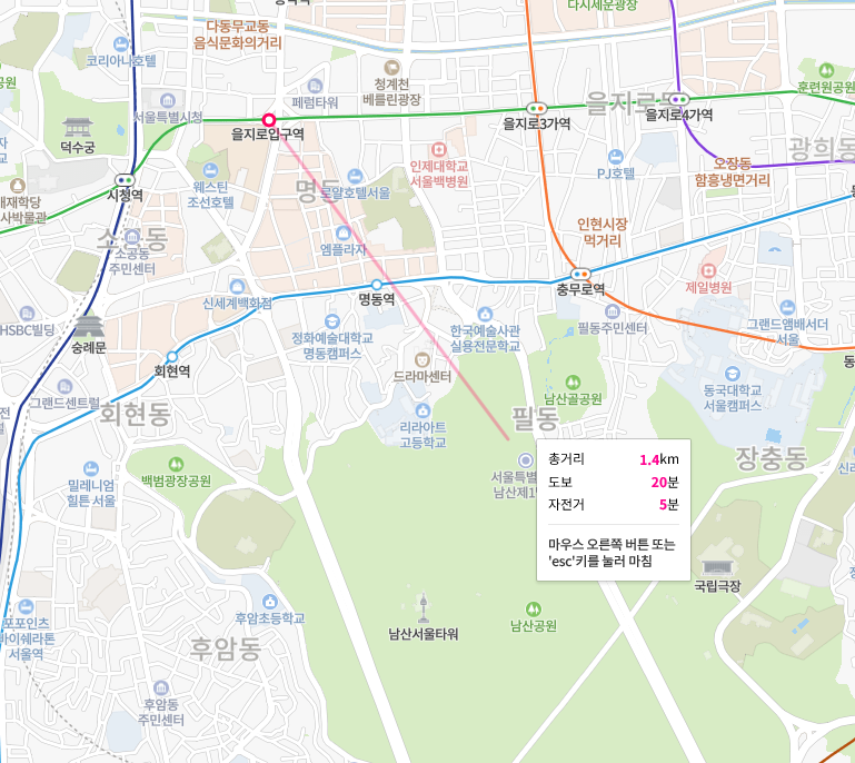 도착지점에 가서 다시 마우스 좌클릭을 해주세요. 이어서 다른 지점을 마우스 좌클릭으로 계속 선택해주실 수 있는데요. 선택한 곳이 마지막 도착 지점이라면 마우스 좌클릭으로 마지막 지점을 선택해주시고 마우스 우클릭을 한 번 눌러주세요. 총거리 뿐만 아니라 도보 하는 경우의 소요시간, 자전거를 이용하는 경우의 소요시간까지 자세하게 나와서 굉장히 편안한 동선 예상이 가능하시답니다.