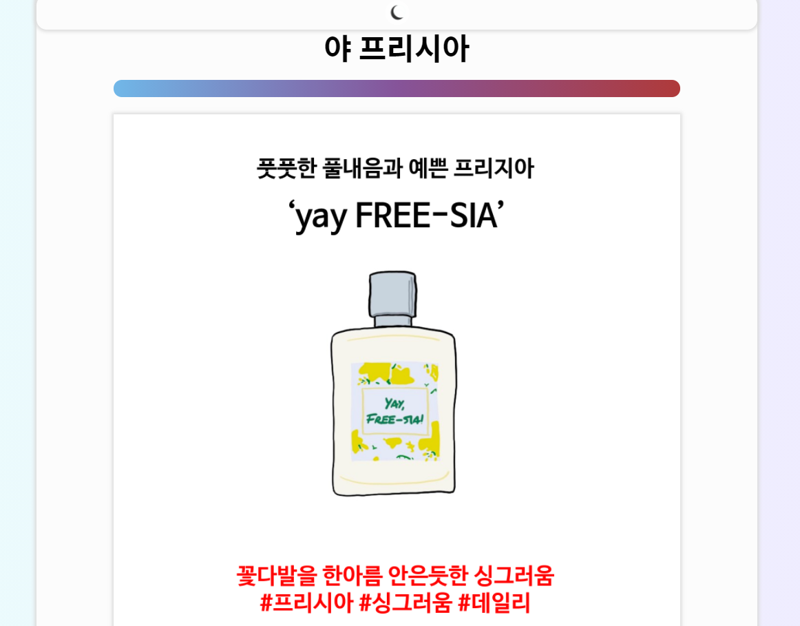 저는 풋풋한 풀내음과 예쁜 프리지아! 싱그러운 데일리 향수를 추천받았습니다. 꽃다발을 한아름 안은 듯한 싱그러운 향기가 어울린다고 하네요.