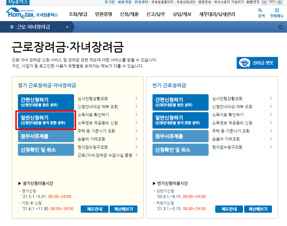 신청 안내문을 받지 못한 경우 PC 홈텍스 홈페이지에 접속하셔서 근로장려금·자녀장려금 페이지에 '일반신청하기'로 접속하신 후 절차에 따라 작성해주시면 됩니다.