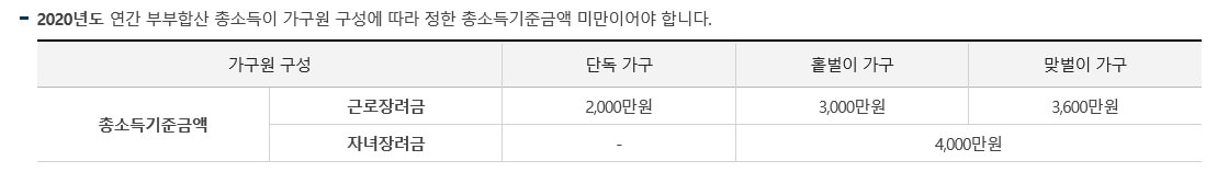 3. 맞벌이가구인 경우: 2020년 총소득 3천 6백만원 미만(본인과 배우자 각각의 총급여액 등이 3백만원 이상인 가구)