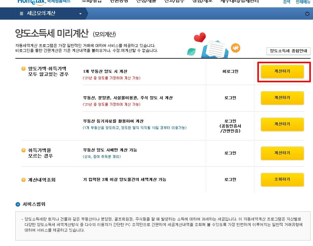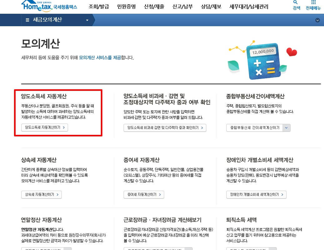 모의계산 페이지에서 '양도소득세 자동계산'으로 접속해주세요.