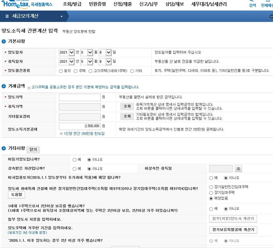 양도소득세는 주택 수나 보유기간 등에 따라 달라져 복잡할 수 있습니다. 양도소득세 자동계산 방법을 이용하시면 더욱 쉽게 계산이 가능합니다. 국세청 홈텍스에서 제공하는 양도소득세 자동계산기를 활용하면 편안하게 자동으로 계산해볼 수 있는데요.