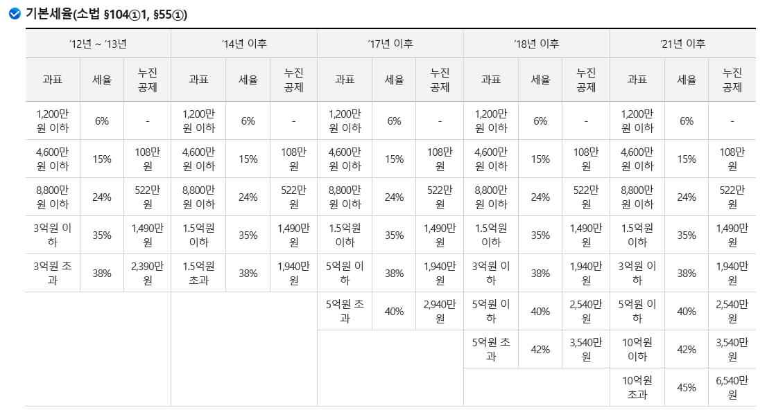 양도소득세의 기본 세율은 위와 같습니다. 2년 이상 보유하신 경우에 해당 세율 적용이 가능하며 2년 미만 보유인 경우에는 단기보유 세율을 적용 받을 수 있습니다. 단기보유 세율은 1년 미만은 50%, 2년 미만은 40%를 적용 받습니다.