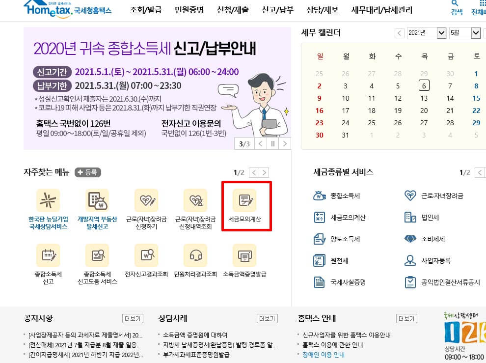 자주찾는 메뉴 중 세금모의계산으로 접속해주세요.