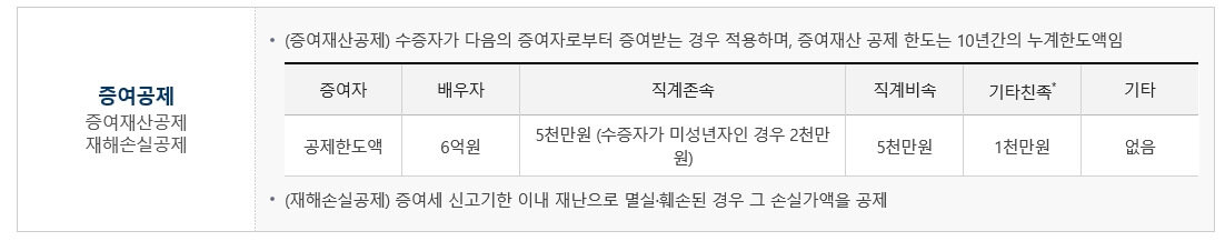 배우자의 경우 6억원, 직계존속인 자녀가 성년인 경우에는 5천만원, 미성년인 경우에는 2천만원이 면제한도액입니다.