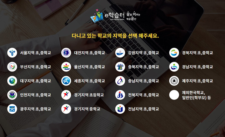 서울지역, 대전지역, 강원지역, 경북지역, 부산지역, 울산지역, 충북지역, 경남지역, 대구지역, 세종지역, 충남지역, 제주지역, 인천지역, 경기지역, 전북지역, 광주지역, 전남지역, 재외한국학교 초등학교와 중학교 중 다니고 있는 학교의 지역을 선택해주세요.