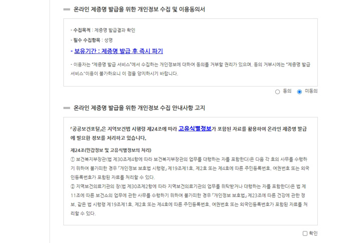 보건증 온라인 재발급을 위한 개인정보 수집 및 이용 동의서에 동의를 체크하시면 됩니다.