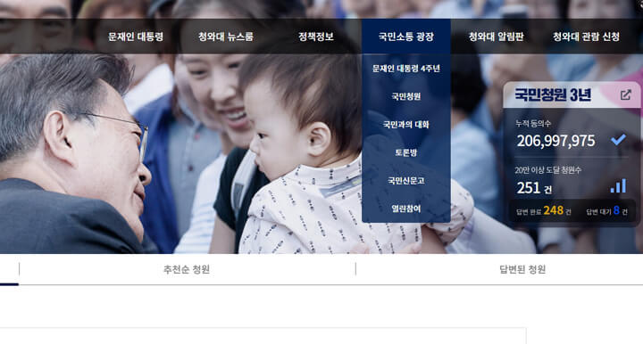 청와대의 직접 소통은 '국민이 물으면 정부가 답한다'는 철학을 지향하고 있습니다. 국정 현안 관련, 국민들 다수의 목소리가 모여 30일 동안 20만 이상 추천 청원에 대해서는 정부 및 청와대 책임자(각 부처 및 기관의 장, 대통령 수석·비서관, 보좌관 등)가 답변하고 있습니다.