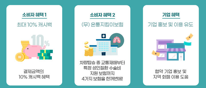 온통대전카드는 자영업자와 소비자가 동시에 혜택을 받을 수 있는 카드이며 소비자는 결제하는 금액의 10%를 캐시백으로 입금받는 혜택이 있습니다. 한도는 최대 월 50만원입니다. 플러스 할인가맹점을 신청한 가맹점에서는 소비자는 5% 이상 할인 혜택을 추가로 받으실 수 있으며 가맹점은 무료 홍보 서비스를 제공받을 수 있습니다.