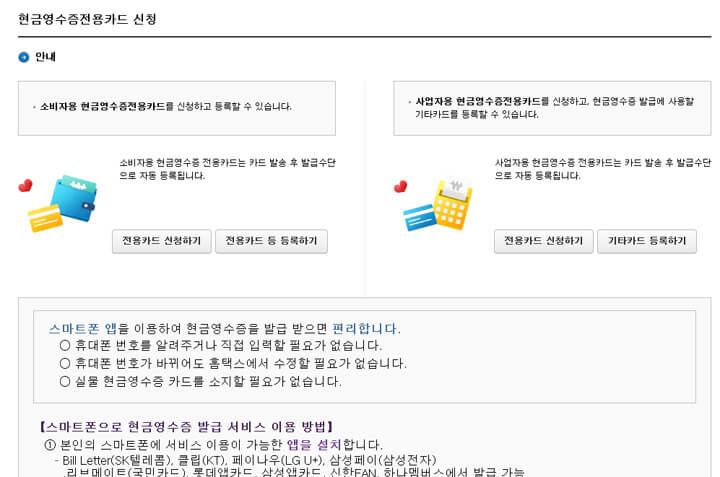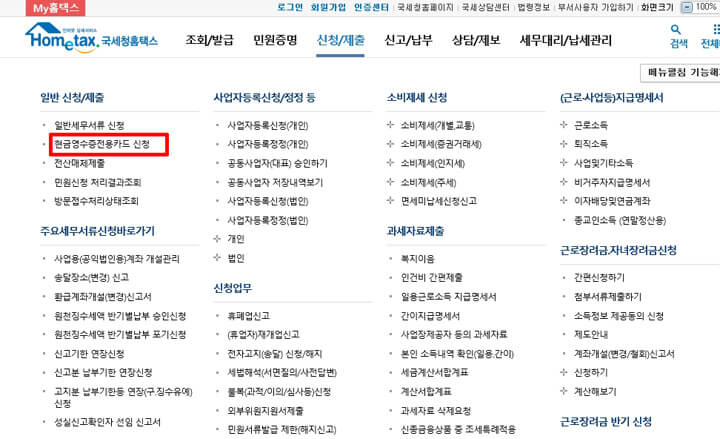 3. 현금영수증 전용카드 신청 메뉴 접속
