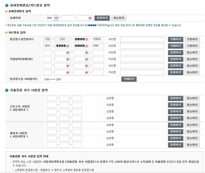 현금영수증 등록에 사용할 휴대전화번호를 확인하시거나 수정하실 수 있으며 기존에 등록해두신 카드가 있으시다면 등록한 카드 목록을 확인하실 수 있습니다.