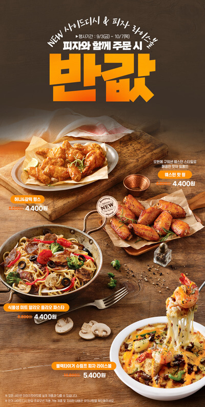 - 인기 사이드 반값 적용 가능 제품 : 웨스턴 핫 윙, 허니&갈릭 윙스, 식물성 미트 알리오 올리오 파스타, 뉴욕 오리진 피자 라이스볼(Bowl), 포테이토 피자 라이스볼(Bowl), 블랙앵거스 스테이크 피자 라이스볼 (Bowl), 블랙타이거 슈림프 피자 라이스볼 (Bowl)