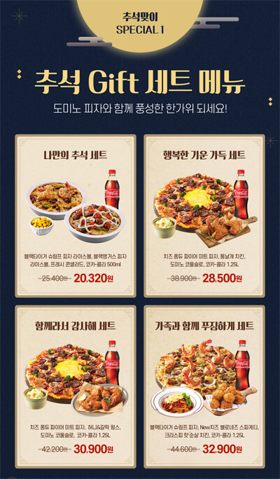 도미노피자는 추석맞이 기프트 세트를 출시했습니다. 나만의 추석세트로 혼자서 즐길 수 있는 세트 메뉴부터 가족과 함께 푸짐하게 즐길 수 있는 세트까지 준비되어있는데요.