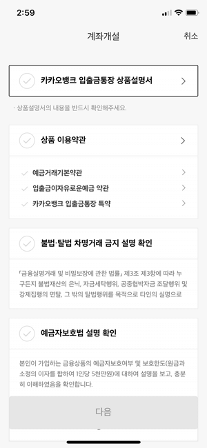 2. 카카오뱅크 입출금통장 상품설명서와 이용약관을 확인하신 후 '다음'을 눌러주시면 됩니다.