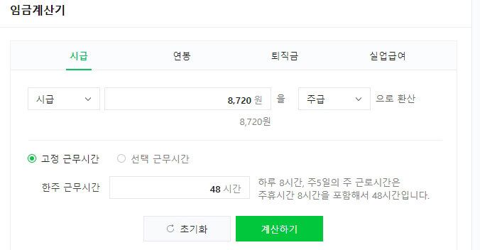 2. 2021 최저시급 8,720원을 입력하신 후 주급, 월급 중 환산을 원하는 급여 방식을 선택하시면 됩니다.