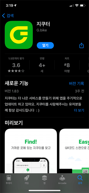 지쿠터를 타기 위해서는 먼저 지쿠터 어플을 실행해주셔야 합니다. 플레이스토어에 '지쿠터'를 검색하시면 해당 어플을 다운로드하실 수 있습니다.
