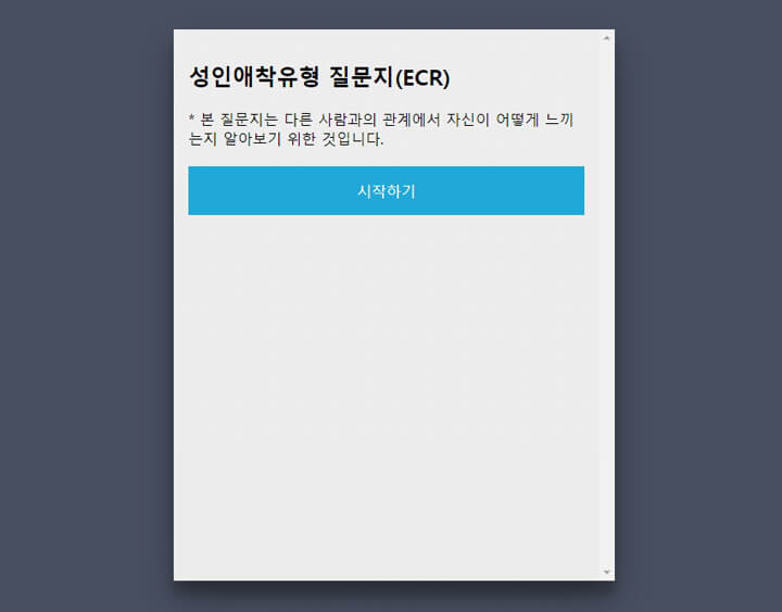 '시작하기'를 눌러주시면 애착유형 테스트가 진행됩니다.