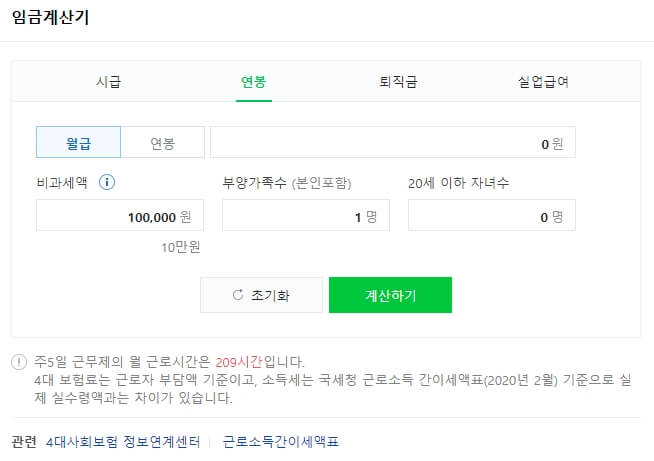 먼저 연봉 실수령액 계산기 바로가기를 통해서 접속해주세요. 네이버에서 연봉 계산기에 자신의 연봉을 기입하고 본인을 포함한 부양가족, 20세 이하 자녀수를 입력하고 '계산하기'를 눌러주시면 됩니다. 간편하게 내가 받을 수 있는 2021 연봉 실수령액을 확인하실 수 있습니다.