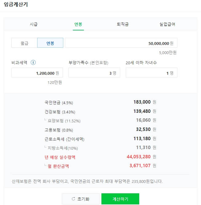 연봉이 5000만 원인 경우 실수령액은 얼마나 되는지 계산해보도록 하겠습니다.