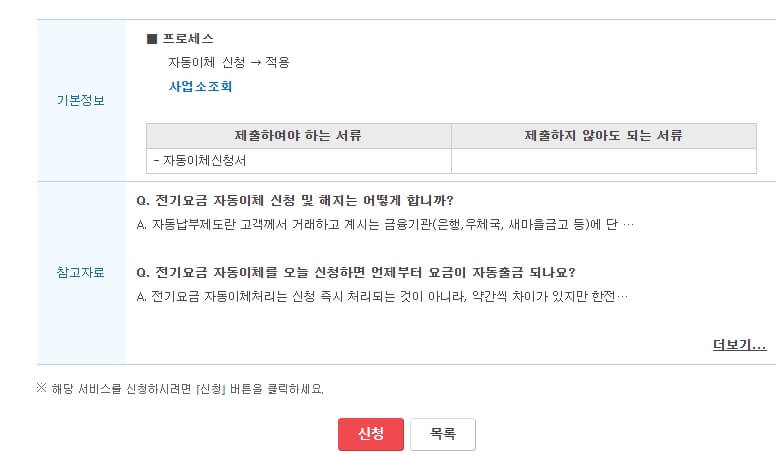 전기요금 자동이체를 요청하려는 장소의 고객번호를 선택하시고 '신청서 작성'을 클릭해주시면 됩니다.
