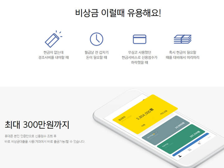 휴대폰 본인 인증만으로 신용점수 조회 후 바로 비상금대출을 사용(계좌에서 바로 출금 가능)할 수 있습니다.