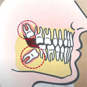 위의 치아 아래 치아 통틀어서 얘기를 한다면 사랑니가 앞에 치아가 있을 때 사랑니가 대각선으로 누워 있는 경우입니다. 이런 경우가 4위에 해당한다고 볼 수 있습니다. 이런 경우에는 어떻게 보면 사랑이가 나오기 어려운 구조이긴 하지만 우리가 이제 핸드피스로 치아를 앞면을 자르게 되면 자른 부분을 빼고 치아를 흔들어서 비교적 다른 사랑니 매복 위치에 비해서는 간단하게 나온다고 볼 수 있습니다.