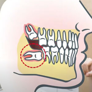 치아가 있을 때 사랑니가 앞으로 누워 있는 게 아니라 반대로 뒤로 누워 있는 경우입니다. 이 경우가 어떻게 보면 가장 어렵다고 볼 수 있습니다. 이런 경우에는 사랑니를 자르기도 어렵고 빼내기도 어렵고 여러 가지로 우리가 시야도 접근이 안 되고 우리가 빼는 방향이랑도 맞지가 안 때문에 치아를 갈아내거나 아니면 주변에 있는 뼈를 많이 쳐야 되는데 우리가 보통 이제 뼈를 많이 갈아낼수록 마취가 풀렸을 때 고통이 심하게 됩니다. 그렇기 때문에 사람마다 '별로 안 아팠는데 치아를 많이 갈아낸 것 같다.' 이런 경우에는 보통 뼈가 아니라 치아만 갈아냈을 가능성이 있고 '뭔가 갈아냈는데 빼고 나니까 너무 두통이 심하다' 하는 경우에는 치아보다는 주변에 뼈를 많이 쳤기 때문에 그만큼 후유증이 심하다는 볼 수 있습니다. 반대로 누워 있는 경우에는 여러 가지 난이도가 높아지고 시간도 오래 걸리기 때문에 결국에 파노라마 사진을 봤을 때 아까 말씀드린 것처럼 누워 있는 방향이나 위치에 따라서 사랑니의 난이도가 결정이 되고 내가 사랑니를 뺐을 때 얼마나 고통이 있겠구나 하는 것을 짐작할 수 있을 것 같습니다.